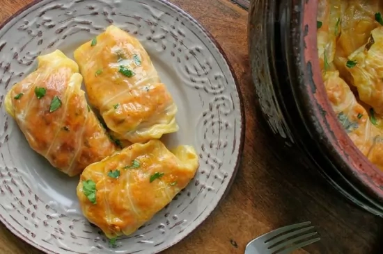 Зелевите листа се почистват от големите жили. Върху всеки лист се поставя 1 с.л. плънка и навиваме на рулце. На дъното на глинен съд се нарязва останалото кисело зеле.