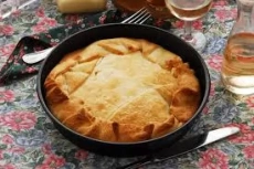 Необходими продукти: за тестото: 500 г брашно 1 ч. л. сода за хляб сол на вкус олио за намазване 1 жълтък за намазване за плънката: 1 пиле (1 кг) 5–6 глави лук 1/2 ч. ч. ориз
