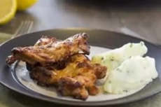 Необходими продукти: 6 пилешки пържоли от бут (без кожа) 1 лимон 80 мл зехтин „Екстра върджин“ 2 с. л. дижонска горчица 2 с. л. майонеза сол и бял пипер на вкус за гарнитурата: 800 г карт